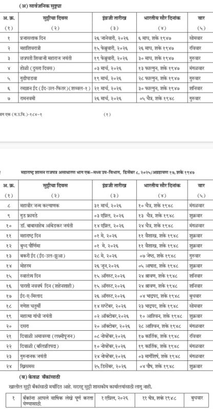 मुंबई, दि. ९: महाराष्ट्र शासनाने २०२६ या वर्षासाठी राज्यातील सर्व शासकीय कार्यालयांसाठी २४ सार्वजनिक सुट्ट्या जाहीर केल्या असून, भाऊबीज (११ नोव्हेंबर २०२६, बुधवार) यादिवशी अतिरिक्त सार्वजनिक सुट्टी जाहीर केली आहे, सामान्य प्रशासन विभागाने या संदर्भातील अधिसूचना जारी केली आहे.