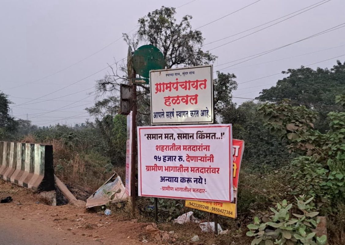 कणकवली: निवडणुकीच्या काळात पैशांचा पाऊस पडतो, हे काही नवीन नाही. मात्र, याच पैशांच्या वाटपावरून आता मतदारांनी चक्क बॅनरबाजी करत राजकीय नेत्यांना चिमटा काढला आहे. कणकवली तालुक्यातील हळवल येथे लावण्यात आलेला एक बॅनर सध्या संपूर्ण जिल्ह्यात चर्चेचा विषय ठरत आहे.