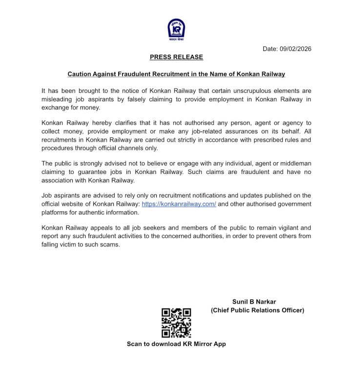 नोकरी संदर्भातील सर्व अधिकृत माहिती आणि अपडेट्ससाठी केवळ konkanrailway.com या अधिकृत संकेतस्थळाचाच वापर करावा. अशा प्रकारच्या संशयास्पद हालचाली आढळल्यास त्याची तातडीने तक्रार करावी, असे आवाहन मुख्य जनसंपर्क अधिकारी सुनील बी. नारकर यांनी केले आहे.