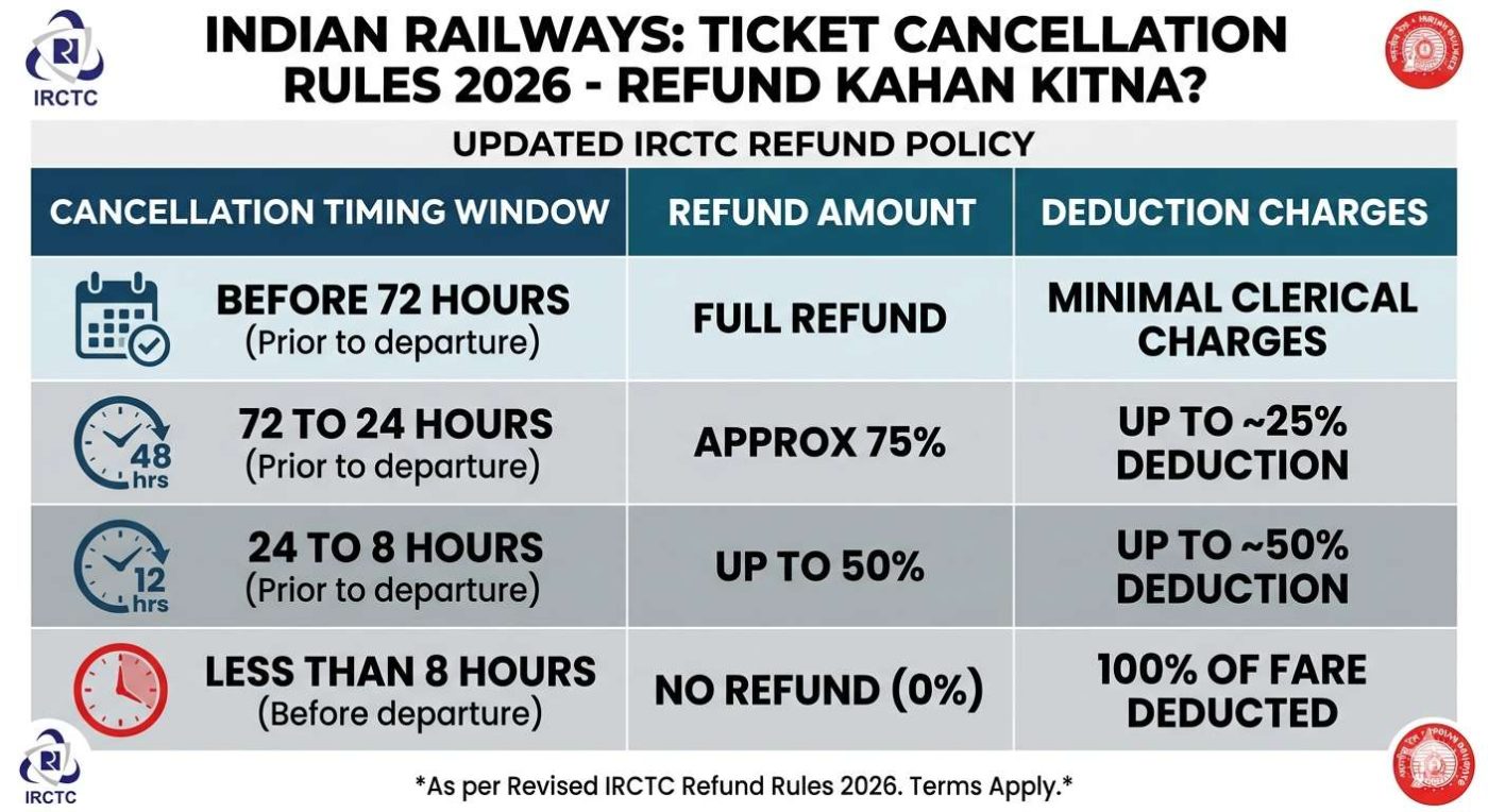 सर्वात महत्त्वाचा बदल म्हणजे आता रेल्वे सुटण्यापूर्वी ८ तासांच्या आत तिकीट रद्द केल्यास कोणताही परतावा मिळणार नाही. जुन्या नियमांनुसार ही मर्यादा ४ तासांची होती, जी आता वाढवून ८ तास करण्यात आली आहे. तसेच, ७२ ते २४ तासांच्या दरम्यान तिकीट रद्द केल्यास सुमारे २५% रक्कम कापली जाईल, तर २४ ते ८ तासांच्या दरम्यान रद्द केल्यास ५०% रक्कम कापली जाईल. जर तुमची ट्रेन हुकली किंवा तुम्ही वेळेत तिकीट रद्द केले नाही, तर तुम्हाला तुमचे पूर्ण पैसे गमवावे लागतील.